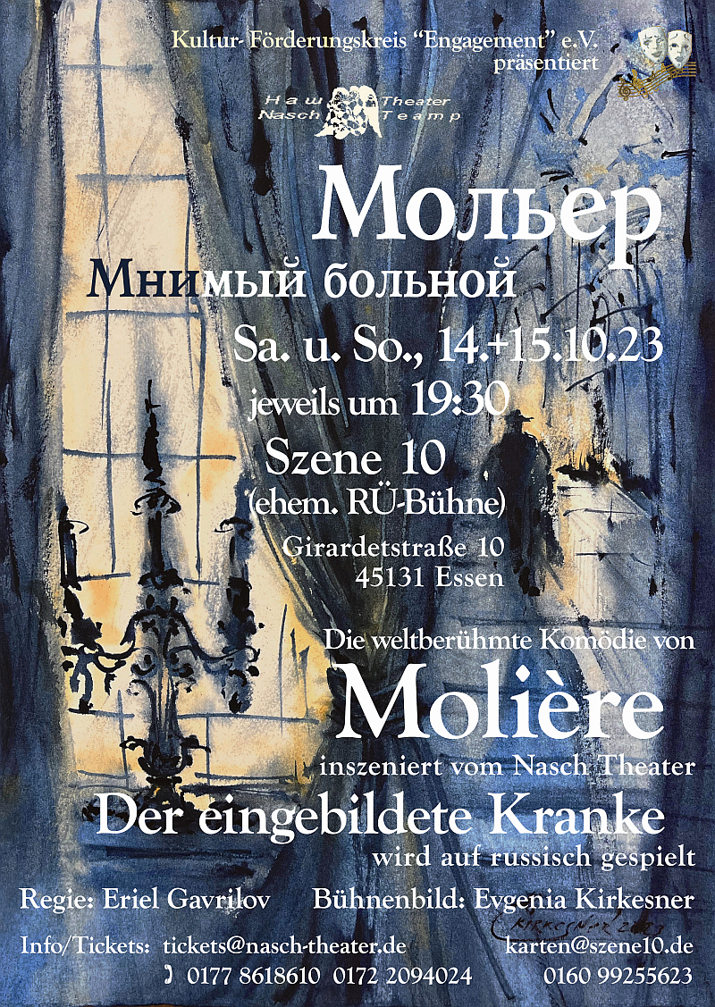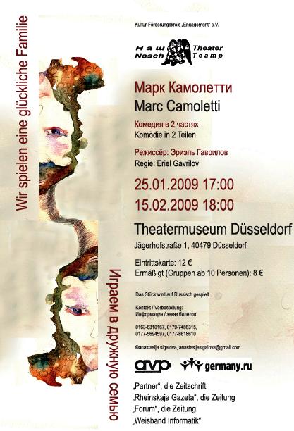 Затем мы представили спектакль для взрослых «Играем дружную семью» (автор Марк Камолетти). Это весёлая и обаятельная комедия положений быстро завоевала зрительские сердца. Мы играли её на сцене Театрального музея и Freizeitstätte Garath Дюссельдорфа.