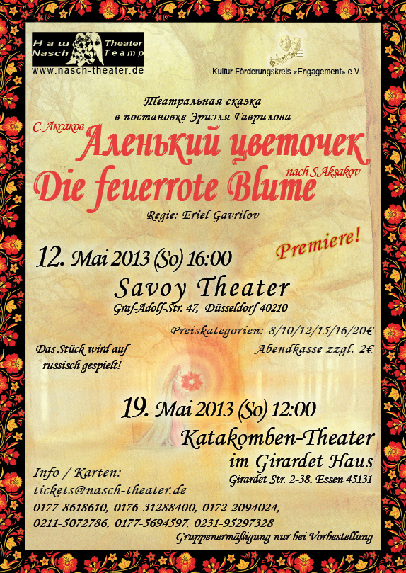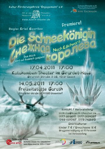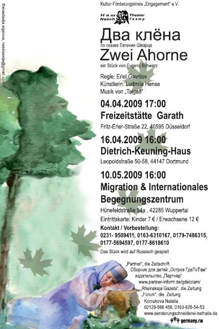 Для следующей постановки мы выбрали детскую пьесу. Замечательную сказку Евгения Шварца «Два клёна» (премьера - 9 декабря 2006 года) посмотрели сотни детей и их родителей в Дюссельдорфе, Эссене, Дортмунде, Вуппертале.